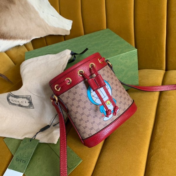 Alta calidad 647801 Doraemon x gucci mini cubo bolso de cuero rojo